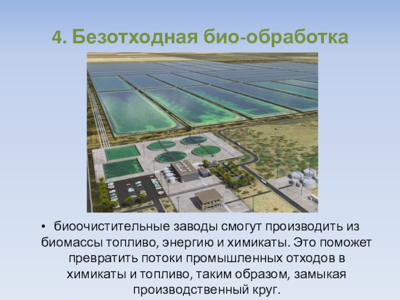 4. Безотходная био-обработкабиоочистительные заводы смогут производить из биомассы топливо, энергию и химикаты. Это поможет превратить потоки промышленных