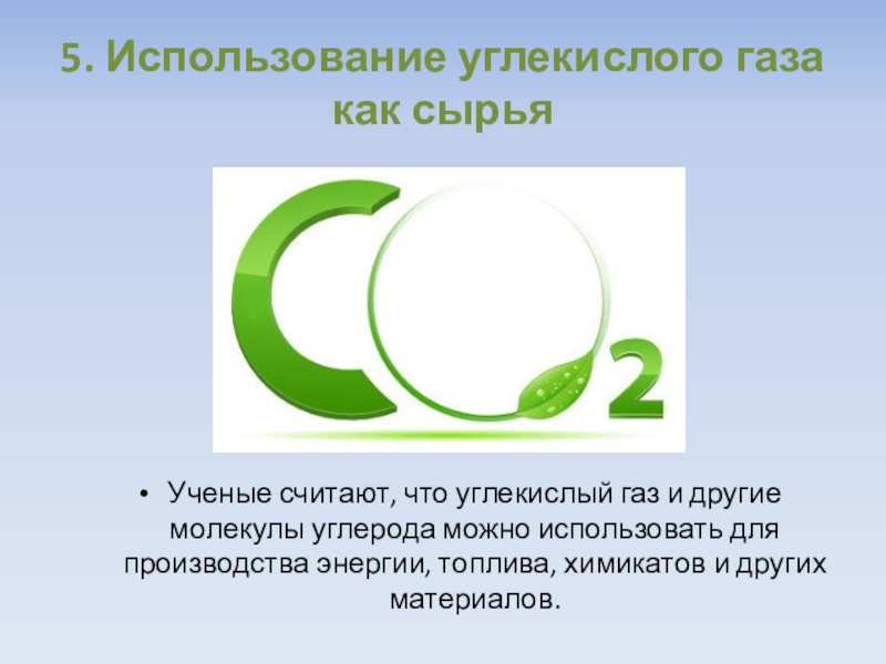 5. Использование углекислого газа как сырьяУченые считают, что углекислый газ и другие молекулы углерода можно использовать для