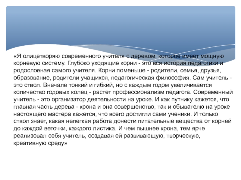 Слайд 7«Я олицетворяю современного учителя с деревом, которое имеет мощную корневую систему.