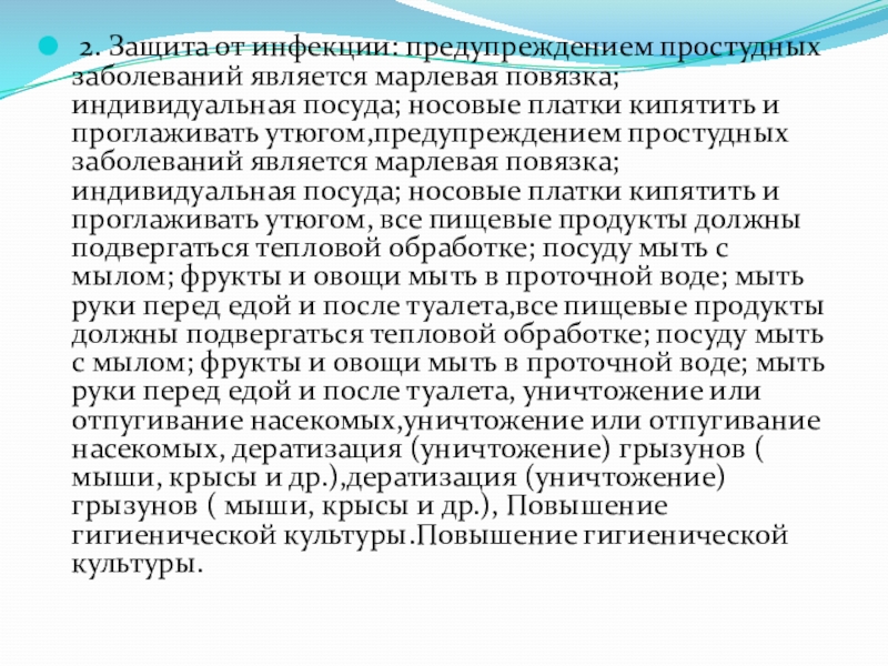 посуда; носовые платки кипятить и проглаживать утюгом,предупреждением простудных заболеваний является марлевая повязка; индивидуальная посуда; носовые платки кипятить и проглаживать утюгом, все пищевые продукты должны подвергаться тепловой обработке; посуду мыть с мылом; фрукты и овощи мыть в проточной воде; мыть руки перед едой и после туалета,все пищевые продукты должны подвергаться тепловой обработке; посуду мыть с мылом; фрукты и овощи мыть в проточной воде; мыть руки перед едой и после туалета, уничтожение или отпугивание насекомых,уничтожение или отпугивание насекомых, дератизация (уничтожение) грызунов ( мыши, крысы и др.),дератизация (уничтожение) грызунов ( мыши, крысы и др.), Повышение гигиенической культуры.Повышение гигиенической культуры.