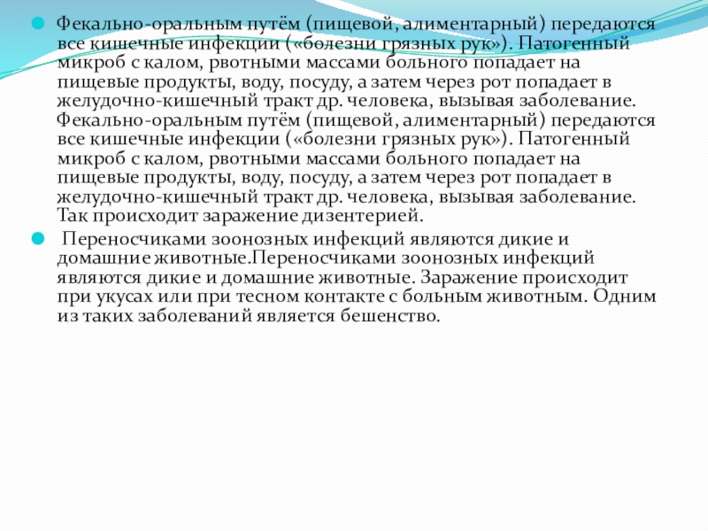 Слайд 7Фекально-оральным путём (пищевой, алиментарный) передаются все кишечные инфекции («болезни грязных рук»).