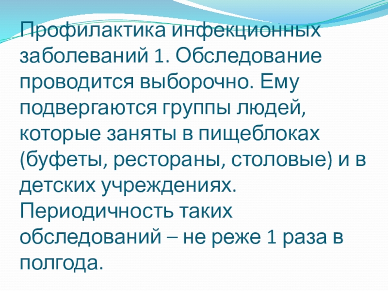 Слайд 9Профилактика инфекционных заболеваний 1. Обследование проводится выборочно. Ему подвергаются группы людей,