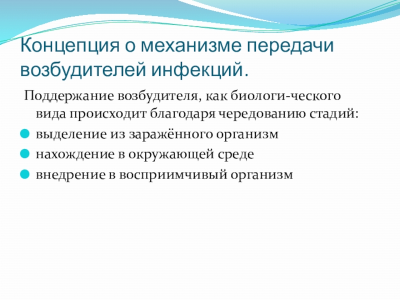 Слайд 3Концепция о механизме передачи возбудителей инфекций.
