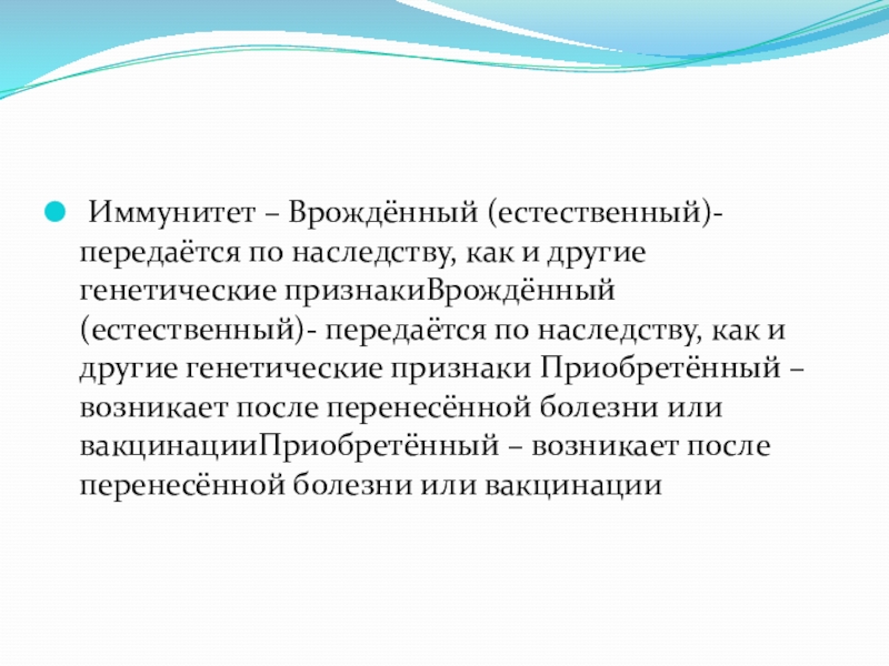 Слайд 13 Иммунитет – Врождённый (естественный)- передаётся по наследству, как и другие генетические