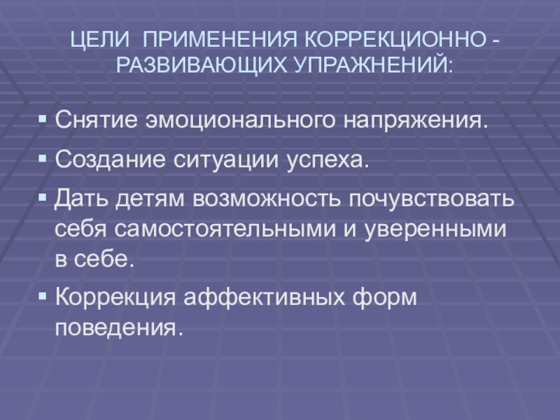 Слайд 5ЦЕЛИ ПРИМЕНЕНИЯ КОРРЕКЦИОННО - РАЗВИВАЮЩИХ УПРАЖНЕНИЙ: