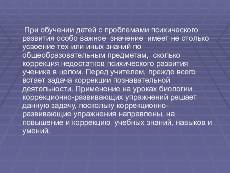 важное значение имеет не столько усвоение тех или иных знаний по общеобразовательным предметам, сколько коррекция недостатков психического развития ученика в целом. Перед учителем, прежде всего встает задача коррекции познавательной деятельности. Применение на уроках биологии коррекционно-развивающих упражнений решает данную задачу, поскольку коррекционно-развивающие упражнения направлены, на повышение и коррекцию учебных знаний, навыков и умений.