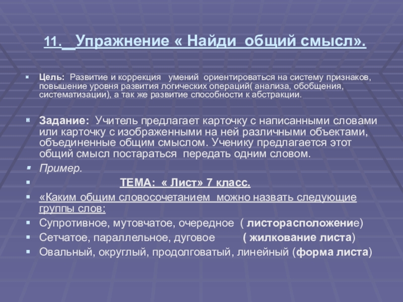 Задание: Учитель предлагает карточку с написанными словами или карточку с изображенными на ней различными объектами, объединенные общим смыслом. Ученику предлагается этот общий смысл постараться передать одним словом.