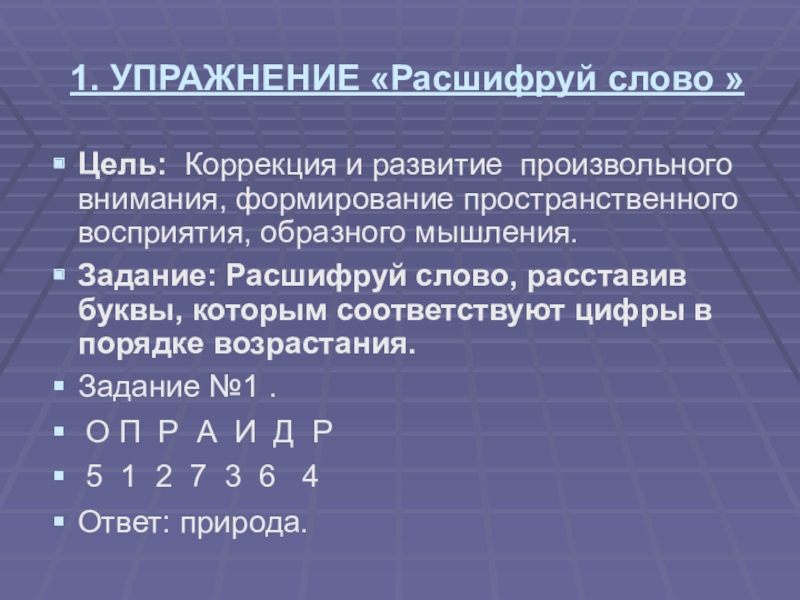 Цель: Развитие и коррекция уровня произвольного внимания,