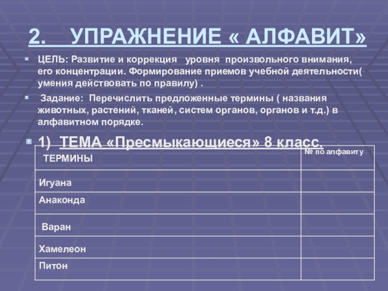 Задание: Перечислить предложенные термины ( названия животных, растений, тканей, систем органов, органов и т.д.) в алфавитном порядке.