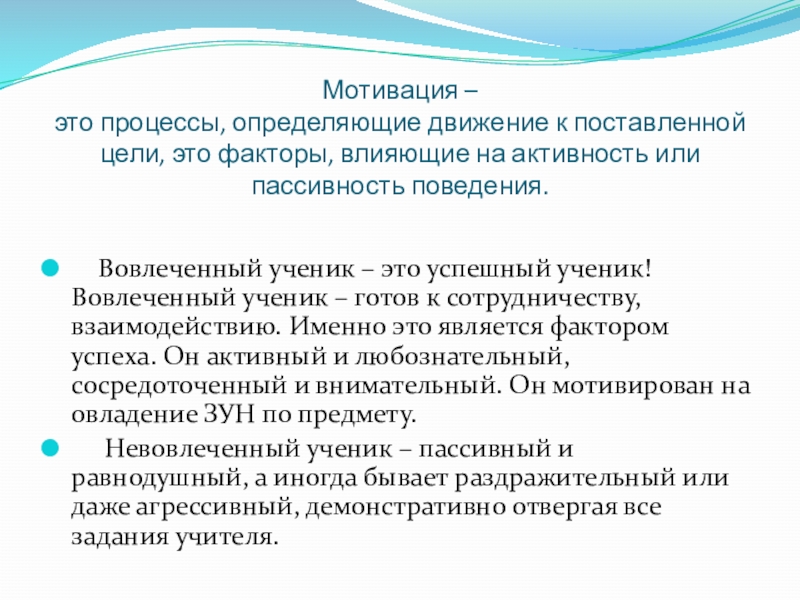 Вовлеченный ученик – это успешный ученик! Вовлеченный ученик – готов к сотрудничеству, взаимодействию. Именно это является фактором успеха. Он активный и любознательный, сосредоточенный и внимательный. Он мотивирован на овладение ЗУН по предмету.