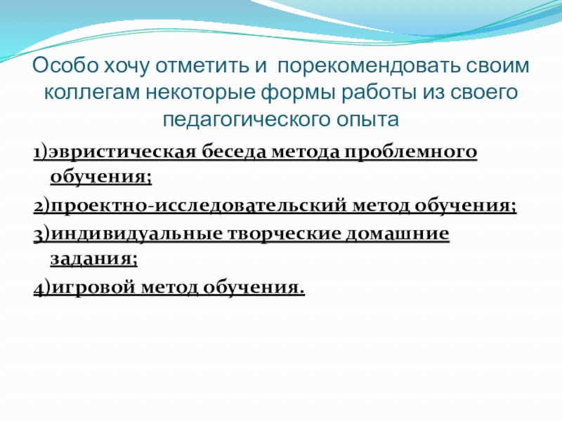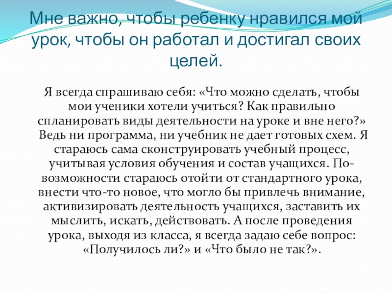 Я всегда спрашиваю себя: «Что можно сделать, чтобы мои ученики хотели учиться? Как правильно спланировать виды деятельности на уроке и вне него?» Ведь ни программа, ни учебник не дает готовых схем. Я стараюсь сама сконструировать учебный процесс, учитывая условия обучения и состав учащихся. По-возможности стараюсь отойти от стандартного урока, внести что-то новое, что могло бы привлечь внимание, активизировать деятельность учащихся, заставить их мыслить, искать, действовать. А после проведения урока, выходя из класса, я всегда задаю себе вопрос: «Получилось ли?» и «Что было не так?».