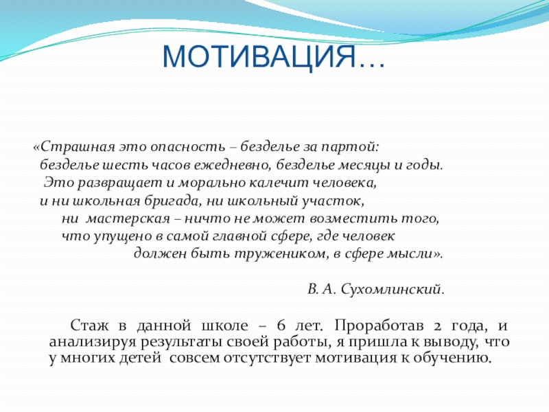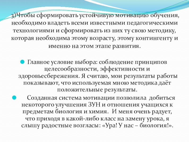 Созданная система мотивации позволила добиться некоторого улучшения ЗУН и отношения учащихся к предметам биология и химия. И меня очень радует, что приходя в какой-либо класс на замену урока, я слышу радостные возгласы: «Ура! У нас – биология!».