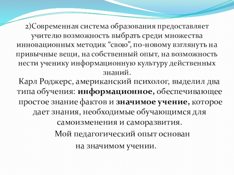 Карл Роджерс, американский психолог, выделил два типа обучения: информационное, обеспечивающее простое знание фактов и значимое учение, которое дает знания, необходимые обучающимся для самоизменения и саморазвития.