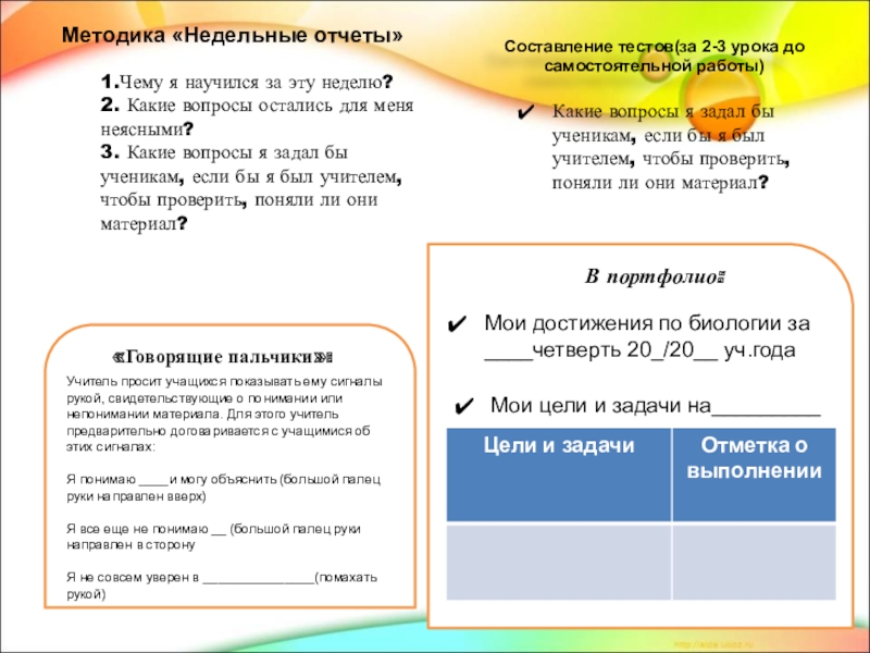 Учитель просит учащихся показывать ему сигналы рукой, свидетельствующие о понимании или непонимании материала. Для этого учитель предварительно договаривается с учащимися об этих сигналах: