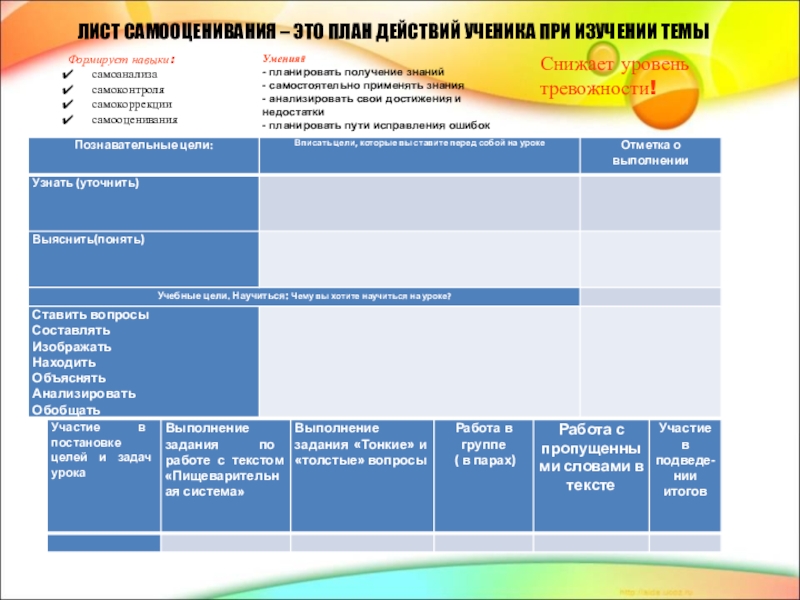 Умения: - планировать получение знаний - самостоятельно применять знания - анализировать свои достижения и недостатки - планировать пути исправления ошибок