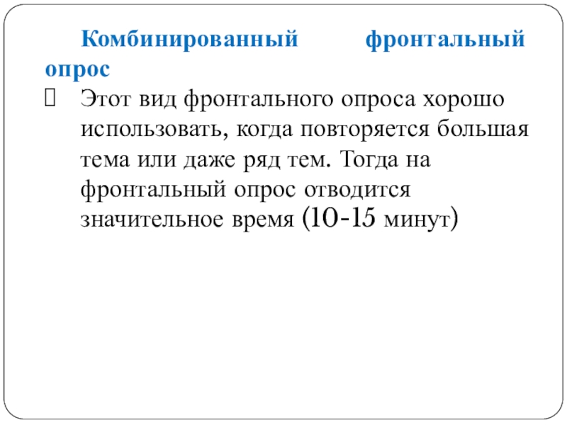 опроса хорошо использовать, когда повторяется большая тема или даже ряд тем. Тогда на фронтальный опрос отводится значительное время (10-15 минут)