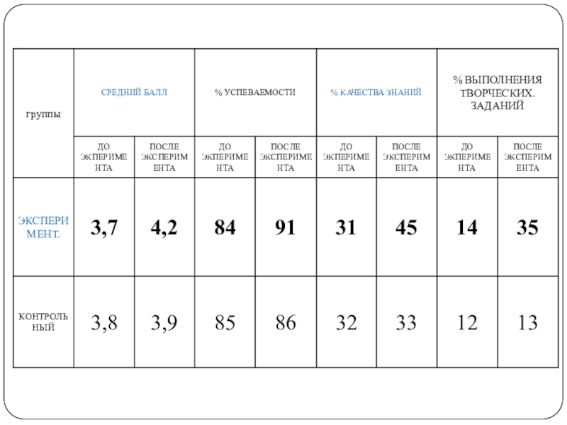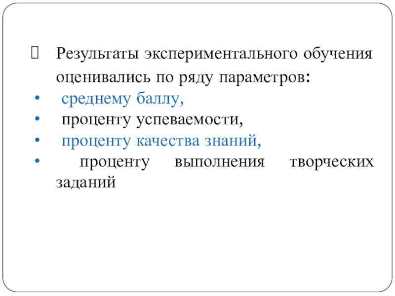 Слайд 43Результаты экспериментального обучения оценивались по ряду параметров: