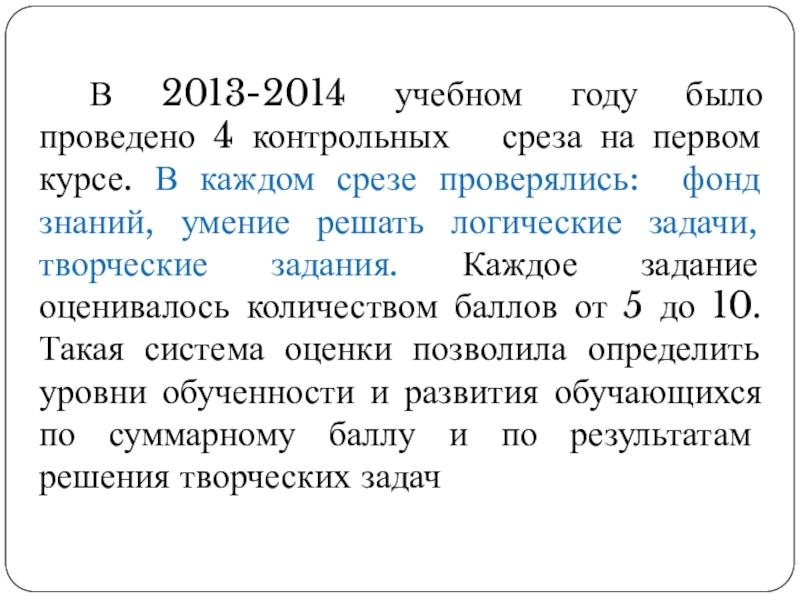 первом курсе. В каждом срезе проверялись: фонд знаний, умение решать логические задачи, творческие задания. Каждое задание оценивалось количеством баллов от 5 до 10. Такая система оценки позволила определить уровни обученности и развития обучающихся по суммарному баллу и по результатам решения творческих задач
