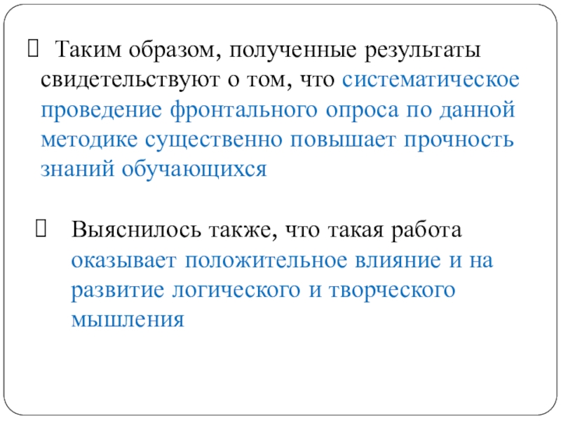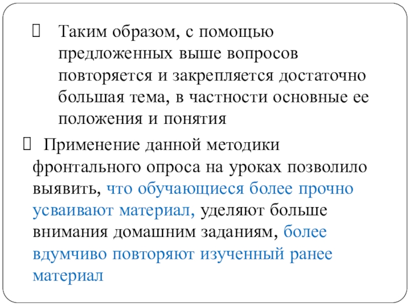 Применение данной методики фронтального опроса на уроках позволило выявить, что обучающиеся более прочно усваивают материал, уделяют больше внимания домашним заданиям, более вдумчиво повторяют изученный ранее материал