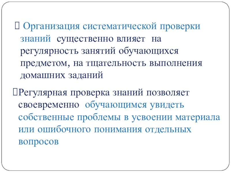 Слайд 6Регулярная проверка знаний позволяет своевременно обучающимся увидеть собственные проблемы в усвоении