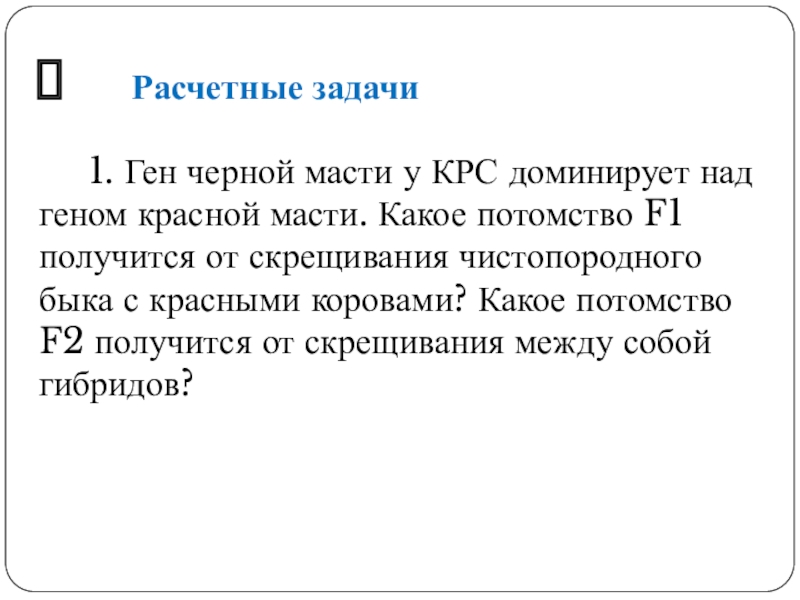геном красной масти. Какое потомство F1 получится от скрещивания чистопородного быка с красными коровами? Какое потомство F2 получится от скрещивания между собой гибридов?