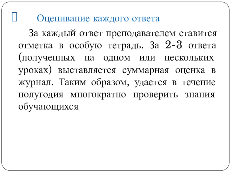 ставится отметка в особую тетрадь. За 2-3 ответа (полученных на одном или нескольких уроках) выставляется суммарная оценка в журнал. Таким образом, удается в течение полугодия многократно проверить знания обучающихся