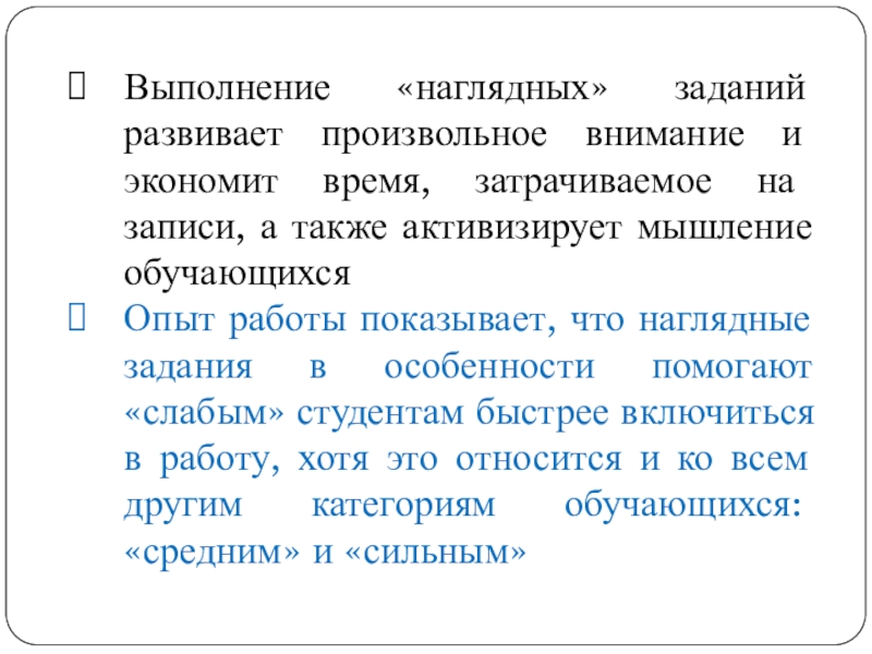 Опыт работы показывает, что наглядные задания в особенности помогают «слабым» студентам быстрее включиться в работу, хотя это относится и ко всем другим категориям обучающихся: «средним» и «сильным»