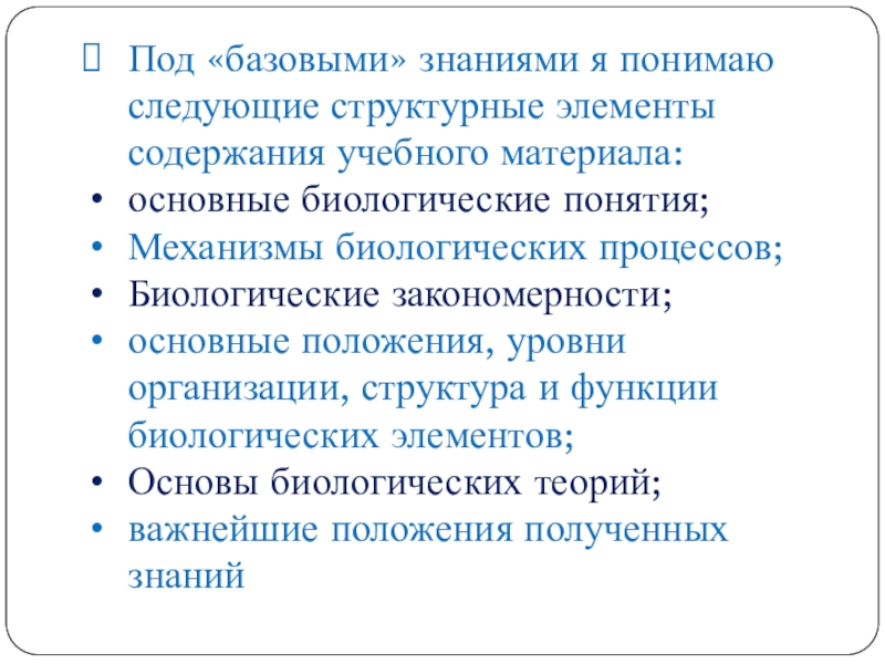 Слайд 11Под «базовыми» знаниями я понимаю следующие структурные элементы содержания учебного материала: