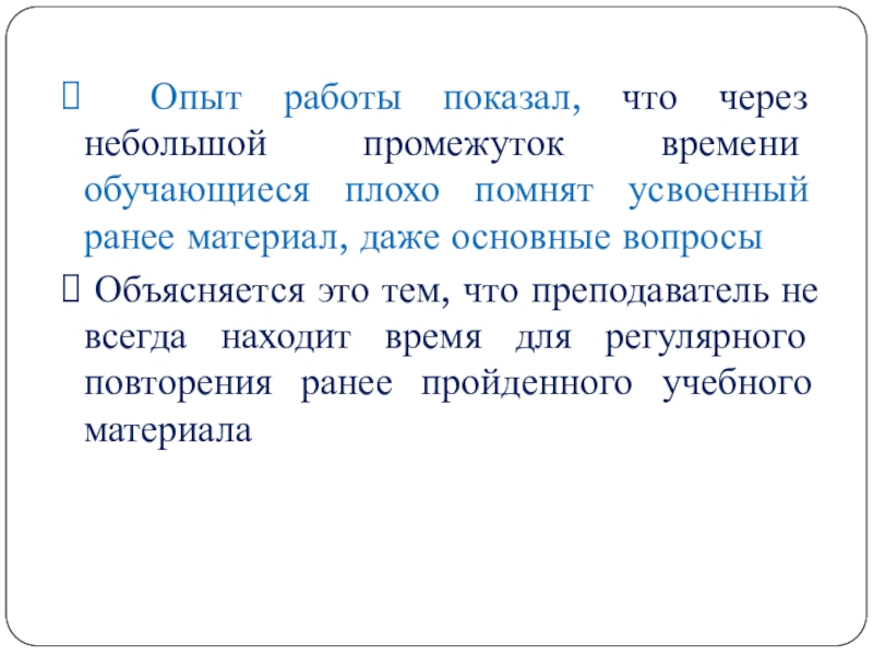 Объясняется это тем, что преподаватель не всегда находит время для регулярного повторения ранее пройденного учебного материала