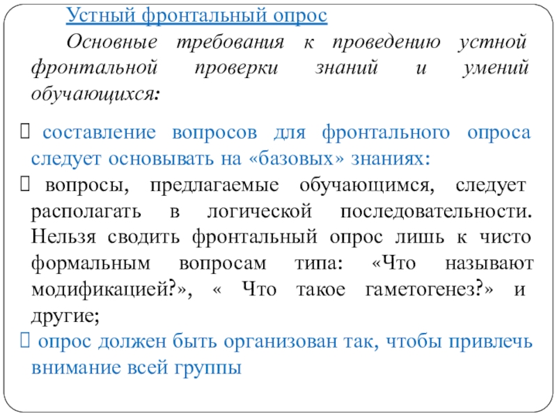 вопросы, предлагаемые обучающимся, следует располагать в логической последовательности. Нельзя сводить фронтальный опрос лишь к чисто формальным вопросам типа: «Что называют модификацией?», « Что такое гаметогенез?» и другие;