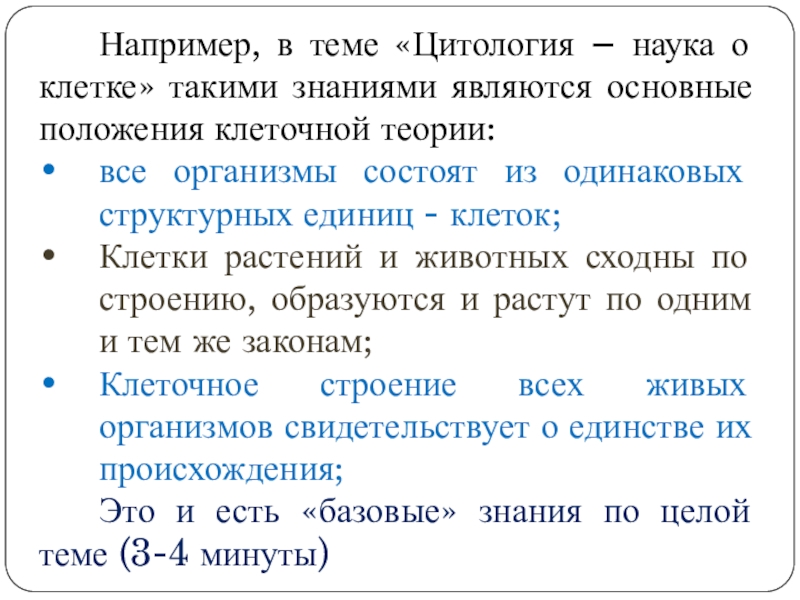 Слайд 16Например, в теме «Цитология – наука о клетке» такими знаниями являются