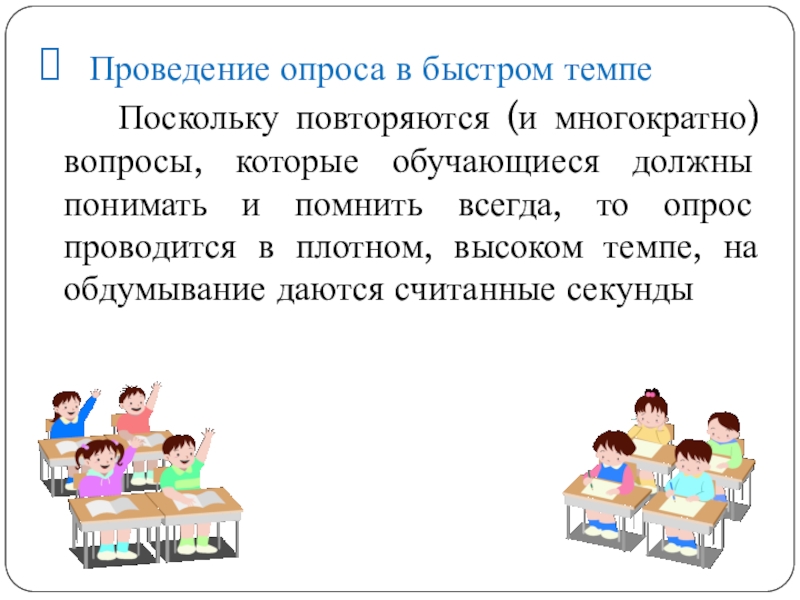вопросы, которые обучающиеся должны понимать и помнить всегда, то опрос проводится в плотном, высоком темпе, на обдумывание даются считанные секунды