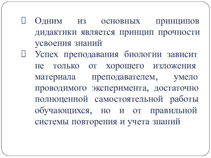 преподавания биологии зависит не только от хорошего изложения материала преподавателем, умело проводимого эксперимента, достаточно полноценной самостоятельной работы обучающихся, но и от правильной системы повторения и учета знаний