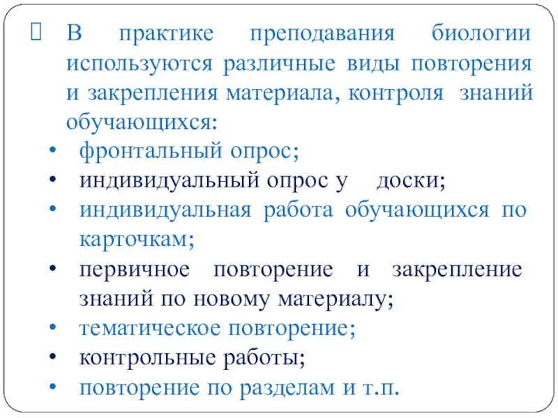 В практике преподавания биологии используются различные виды повторения и закрепления материала, контроля знаний обучающихся:
