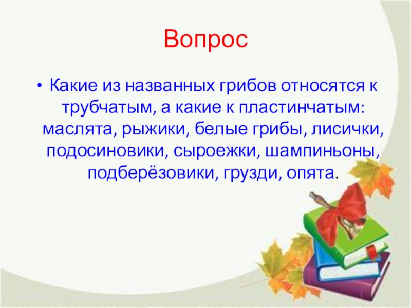 Вопрос Какие из названных грибов относятся к трубчатым, а какие к пластинчатым: маслята, рыжики, белые грибы, лисички,