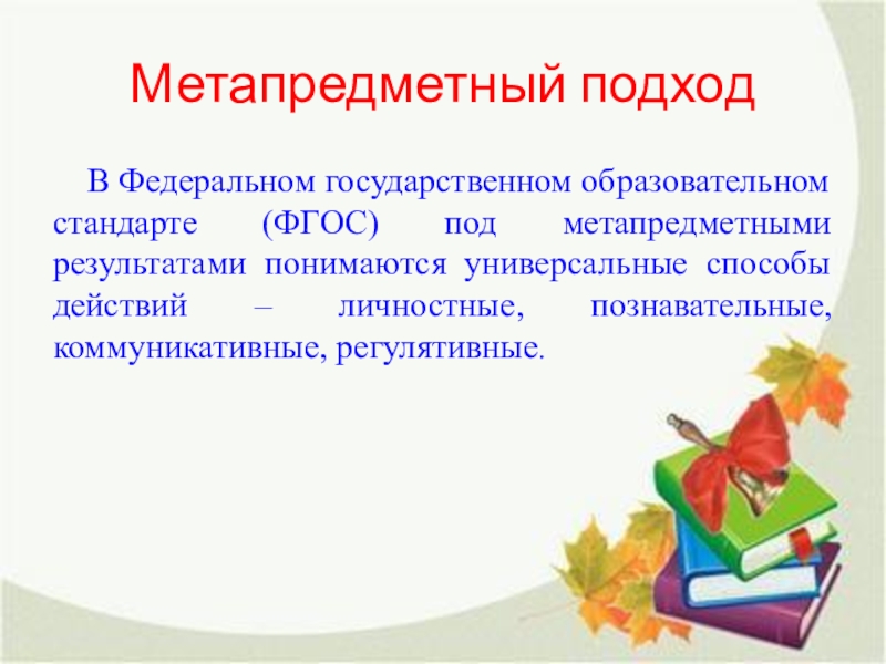 Метапредметный подходВ Федеральном государственном образовательном стандарте (ФГОС) под метапредметными результатами понимаются универсальные способы действий – личностные, познавательные, коммуникативные, регулятивные.