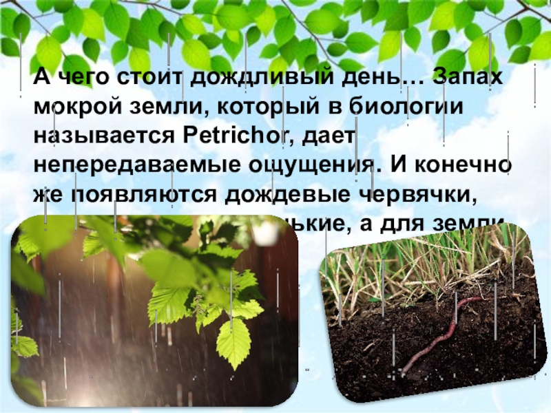называется Petrichor, дает непередаваемые ощущения. И конечно же появляются дождевые червячки, которые такие маленькие, а для земли большие помощники.