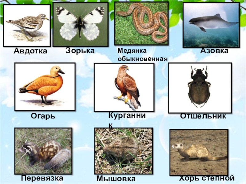 АвдоткаЗорькаМедянка обыкновеннаяАзовкаОгарьКурганникОтшельникПеревязкаМышовка степнаяХорь степной