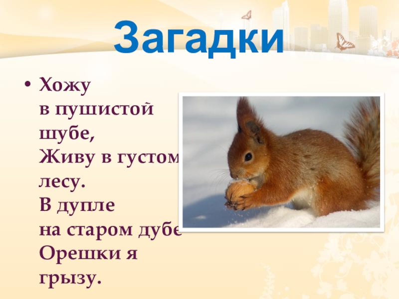 ЗагадкиХожу в пушистой шубе, Живу в густом лесу. В дупле на старом дубе Орешки я грызу.