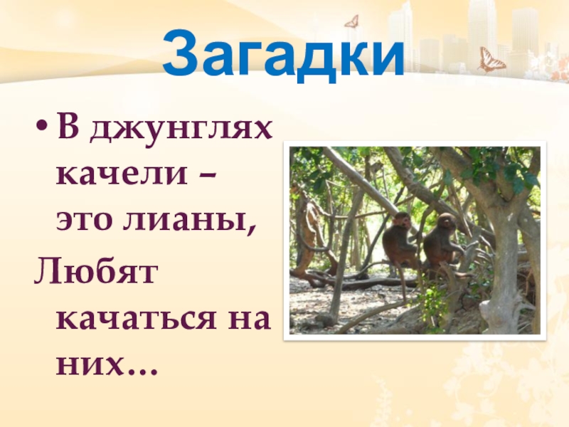 ЗагадкиВ джунглях качели – это лианы,Любят качаться на них…