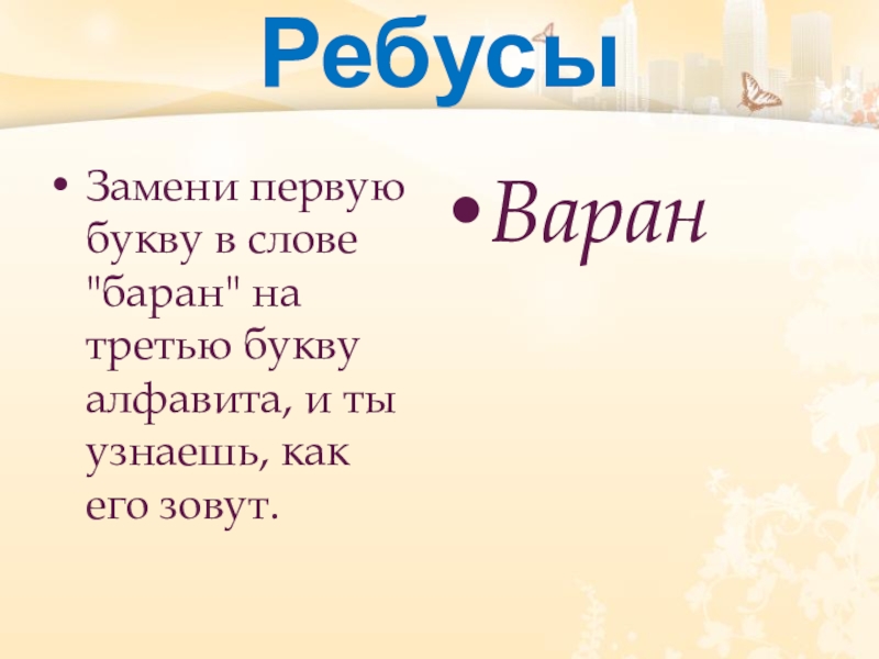 Замени первую букву в слове "баран" на третью букву алфавита, и