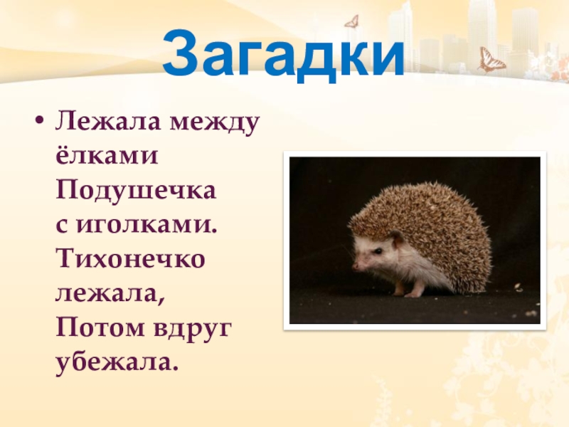 ЗагадкиЛежала между ёлками Подушечка с иголками. Тихонечко лежала, Потом вдруг убежала.