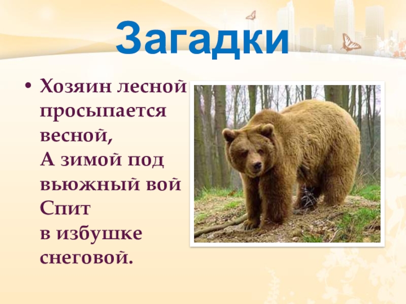 ЗагадкиХозяин лесной просыпается весной, А зимой под вьюжный вой Спит в избушке снеговой.