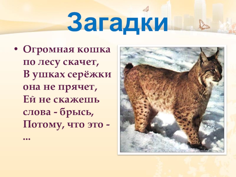 ЗагадкиОгромная кошка по лесу скачет,  В ушках серёжки она не прячет,  Ей не скажешь слова