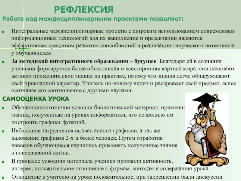 За методикой интегративного образования – будущее. Благодаря ей в сознании учеников формируется более объективная и всесторонняя картина мира, они начинают активно применять свои знания на практике, потому что знания легче обнаруживают свой прикладной характер. Учитель по-новому видит и раскрывает свой предмет, яснее осознавая его соотношение с другими науками.