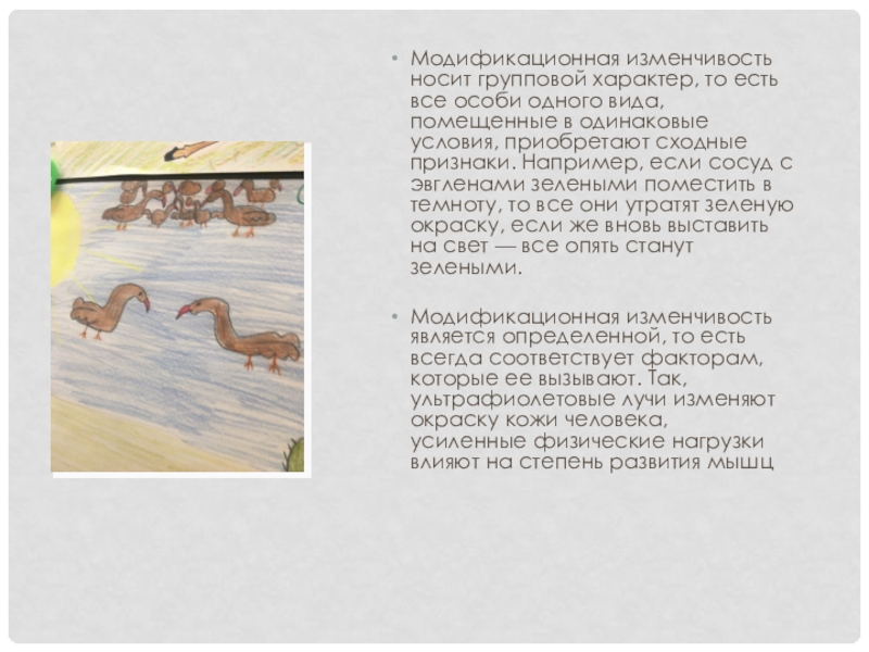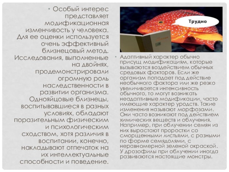 Адаптивный характер обычно присущ модификациям, которые вызываются воздействием обычных средовых факторов. Если же организм попадает под действие необычного фактора или же резко увеличивается интенсивность обычного, то могут возникать неадаптивные модификации, часто имеющие характер уродств. Такие изменения называют морфозами. Они часто возникают под действием химических веществ и облучения. Например, при облучении семян из них вырастают проростки со сморщенными листьями, с разными по форме семядолями, с неравномерной зеленой окраской. У дрозофилы при облучении иногда развиваются настоящие монстры.
