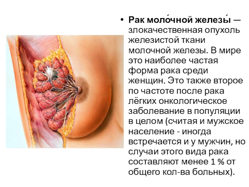 Слайд 2Рак моло́чной железы́ — злокачественная опухоль железистой ткани молочной железы. В мире