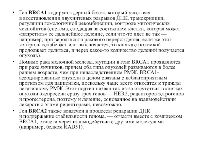 Слайд 5Ген BRCA1 кодирует ядерный белок, который участвует в восстановлении двухнитевых разрывов ДНК,