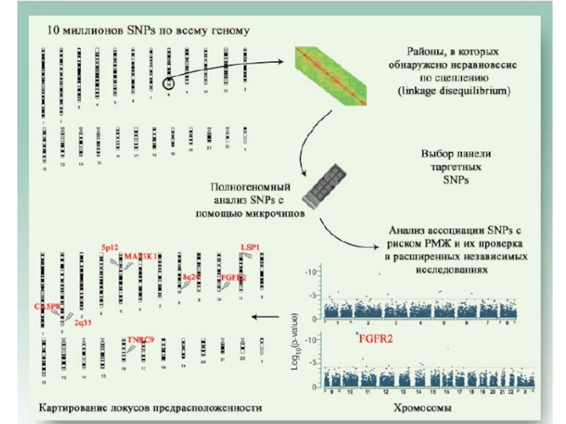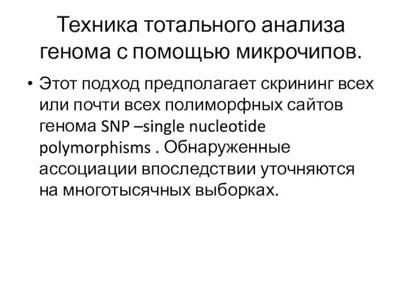 или почти всех полиморфных сайтов генома SNP –single nucleotide polymorphisms . Обнаруженные ассоциации впоследствии уточняются на многотысячных выборках.