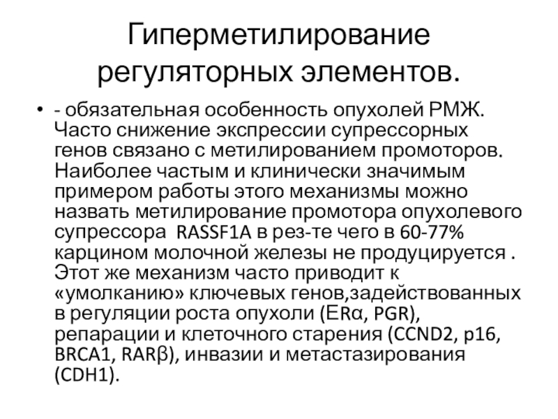 генов связано с метилированием промоторов. Наиболее частым и клинически значимым примером работы этого механизмы можно назвать метилирование промотора опухолевого супрессора RASSF1A в рез-те чего в 60-77% карцином молочной железы не продуцируется . Этот же механизм часто приводит к «умолканию» ключевых генов,задействованных в регуляции роста опухоли (ЕRα, PGR), репарации и клеточного старения (CCND2, p16, BRCA1, RARβ), инвазии и метастазирования (CDH1).